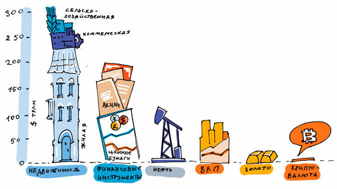 В мировой экономике, а значит, и в жизни всех людей, кроме живущих в джунглях папуасов, недвижимость занимает более важное место, чем может показаться, это самый крупный мировой класс активов. Только жилая недвижимость в мире стоит больше, чем все фондовые рынки, вместе взятые. А вся недвижимость мира оценивается приблизительно в 300 триллионов долларов сколько стоят все товары и услуги, продаваемые в мире в течение трех с половиной лет. Итак, недвижимость самое большое хранилище капитала[2].