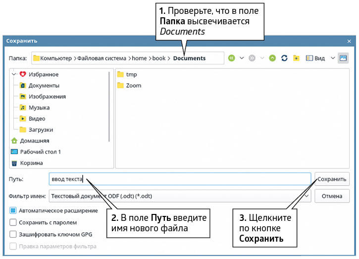 1. Первым делом вам необходимо указать, где будет храниться ваш файл. Для этого используется поле Папка. В данный момент там высвечивается имя папки Documents. О том, что такое папки и зачем они нужны, вы узнаете в следующем уроке. В указанную папку мы и запишем наш первый пробный документ. Как записать документ в произвольную папку, вы подробно узнаете в разделе, посвященном работе в редакторе Writer.