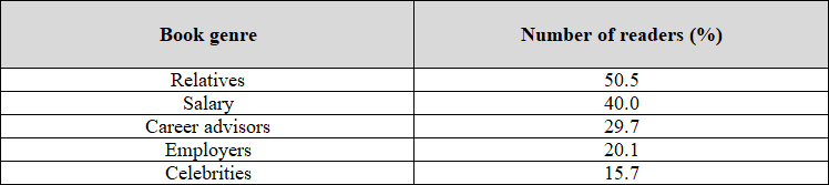 If we start analyzing the information depicted in the table, we will discover that [4] [MANY] [] of the respondents stated that their relatives advice was the most important incentive for a desirable job. Their percentage [5] [EQUAL] [] 50,5%, or slightly more than a half. Another feature of the data shows that roughly one third (29,7%) of the surveyed group are sure it is career advisors who eventually [6] [AFFECT] [] the decision on where to work.