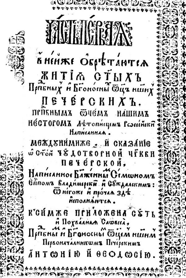 Рис. 3. Титульный лист первой части «Жития Печерских святых», напечатанных в Киево-Печерской Лавре при архимандрите Иоасафе Кроковском на рубеже XVIIXVIII веков. Написано следующее: «ЧАСТЬ ПЕРВАЯ в ней же обретаются ЖИТИЯ СВЯТЫХ ПЕЧЕРСКИХ ПРЕПОДОБНЫМ ОТЧЕМ НАШИМ НЕСТОРОМ Летописцем Российским Написанная».