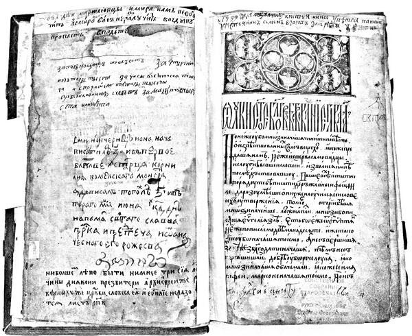 Кстати, обратите внимание, что «киевский черноризец» попытался было написать первую строку русской вязью как это было принято в русских рукописях того времени но сделал это крайне неумело. Для сравнения на рис. 2 мы приводим страницу из подлинной старинной русской рукописи, где первая строка написана настоящей вязью.