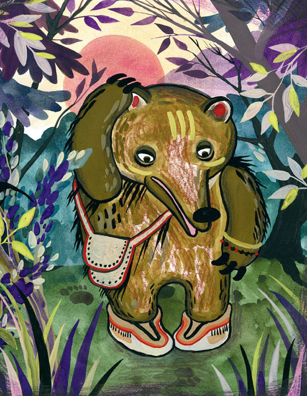 К этому времени солнце уже совсем поднялось, и все ночные звери попрятались. Медведь кинулся за ними скоро, как только мог, в мокасинах, надетых не на ту ногу. Он бежал с большим трудом, переваливался с ноги на ногу.