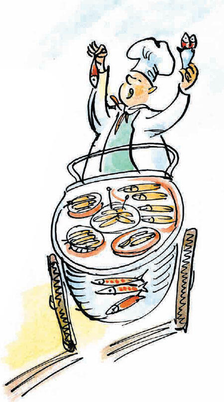 Тем временем сотни рыб окружили со всех сторон бабушку и внучек. Конечно, это были не настоящие рыбы, а переодетые люди. Так уж повелось, что в Португалии все любят сардины. Когда-то эту рыбу даже называли королевской наверное, потому, что её часто подавали во время королевских обедов во дворцах.