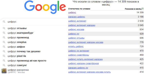 Поисковые подсказки Google (слева) и статистика поисковых запросов в Яндекс Wordstat (справа) по запросу «цифрус»