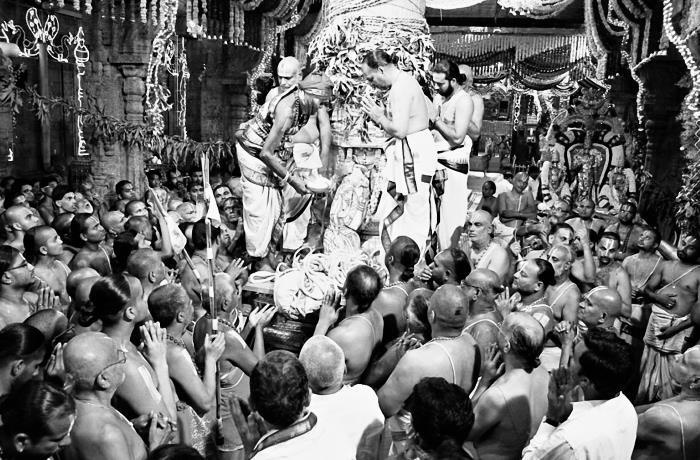 Что касается вишнуитских храмов Южной Индии, то богослужения здесь совершаются в соответствии с двумя основными традициями вайкханаса (vaikhānasa) и панчаратра (pāñcarātra). Причем распространение получила традиция панчаратра, в то время как традиции вайкханаса придерживаются лишь некоторые южноиндийские храмы. В качестве примера можно привести храм Венкатешвары, расположенный на холмах Тирумалы, который на сегодняшний день является центром традиции вайкханаса. Но на количество богослужений разница в традициях особого влияния не оказывает. Здесь пуджи совершаются, как и во многих других больших храмах, в соответствии с установившимся порядком, то есть в течение суток проводится шесть богослужений: рано на рассвете, утром, в полдень, вечером, ночью и в полночь (Ramesh, 2000: 199200). Совсем другое дело сама пуджа. Согласно М. С. Рамешу, в храмовых ритуалах элементы традиции вайкханаса и панчаратра ни в коем случае не должны (даже случайно!) смешиваться друг с другом, ибо такого рода смешение повлечет за собой бедствия для царя и всего царства. Так утверждают Агамы. О том, чтобы добавить какой-либо элемент одной традиции в ритуальную практику другой, не может быть и речи. Даже помышлять о смешении вайкханаса и панчаратра является табу. Если же какой-либо элемент одной из этих традиций окажется в храме, относящемся к другой традиции, то молиться в таком храме и приносить жертвы нельзя до тех пор, пока не будут совершены очистительные и искупительные ритуалы (Ramesh, 2000: 227228).