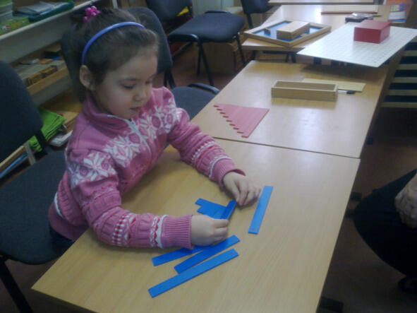 Четырёхлетняя Нирмала учится складывать и вычитать числа с помощью дидактического материала Марии Монтессори "Полоски для сложения и вычитания"