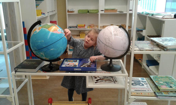 Трёхлетняя девочка самостоятельно изучает географию, используя глобус
