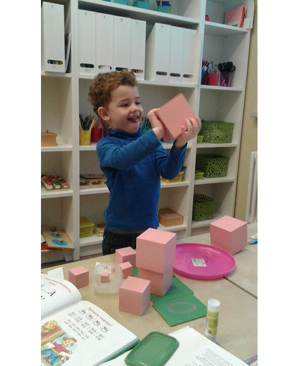 Четырёхлетний Митя, ничего не зная об «арифметической прогрессии» из курса алгебры 9 класса, легко и доступно объяснил, что кубики отличаются размером и весом. И что объём каждого куба больше предыдущего или меньше последующего на 1 см. Мы с ним даже записали формулу «арифметической прогрессии»