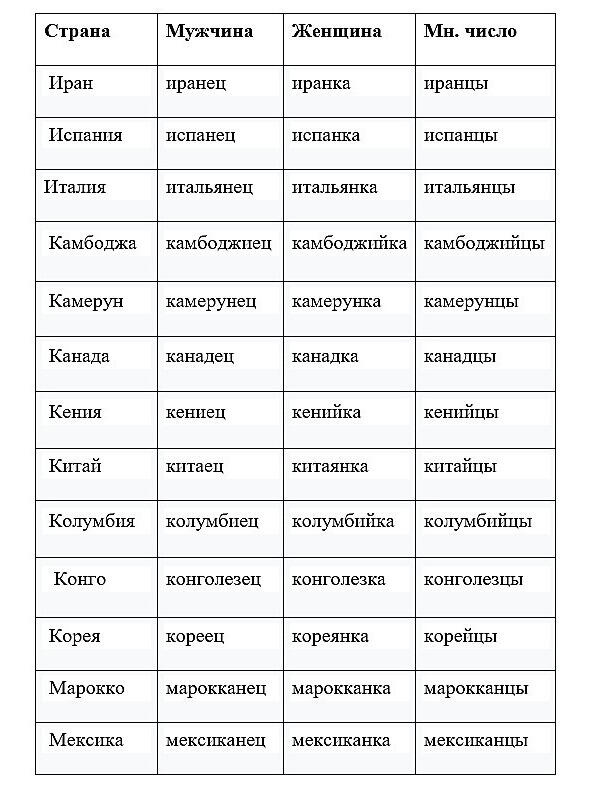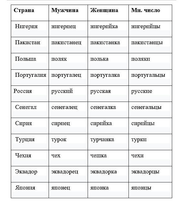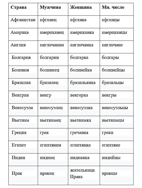 Names of countries in Russian are consonant with their names in European languages. Note that the nationalities of men end with a consonant (the majority has an ending ец), women with vowels (the ending is -ка). The plural has endings ы or и.