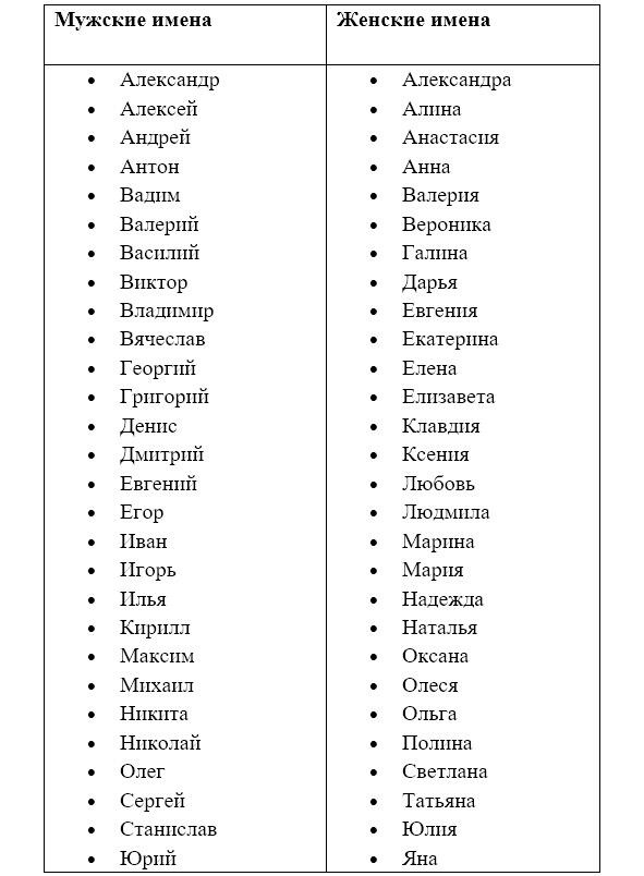 For example, Elena/Lena, Ivan/Vanya, Yelizaveta (Elizabeth) /Lisa. Almost all male names in full form end with a consonant (exception, Nikita, Ilya), female with «a» or «я» vowels (exception Lyubov). Several names can be used for both men and women. For example, Alexander/Alexandra, Eugeniy (Eugene) /Eugenia, Valery/Valeria