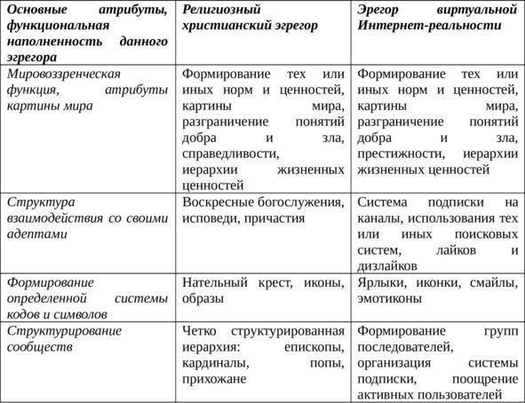 Таблица 1.1. Основные элементы механизма трансформации религиозного эгрегора христианства в эгрегор виртуальной Интернет-реальности