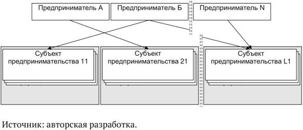 Из рисунка видно, что любой предприниматель может быть собственником нескольких субъектов предпринимательства, действующих в разных сферах деятельности. Отношения собственности между субъектами предпринимательства отсутствуют, либо ими можно пренебречь для целей стратегического управления.