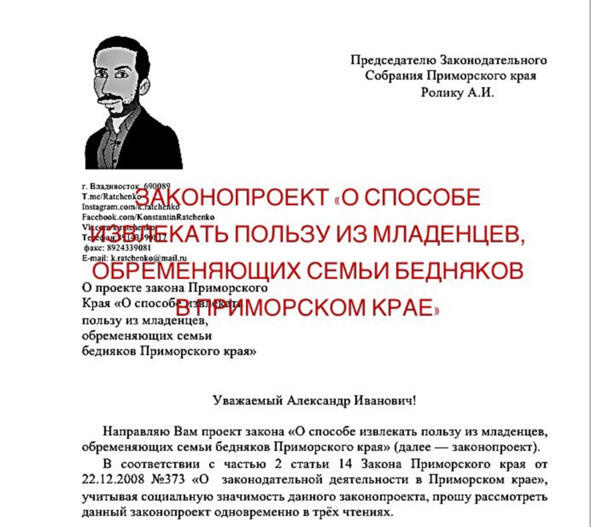 ЗАКОНОПРОЕКТ «О СПОСОБЕ ИЗВЛЕКАТЬ ПОЛЬЗУ ИЗ МЛАДЕНЦЕВ, ОБРЕМЕНЯЮЩИХ СЕМЬИ БЕДНЯКОВ В ПРИМОРСКОМ КРАЕ»