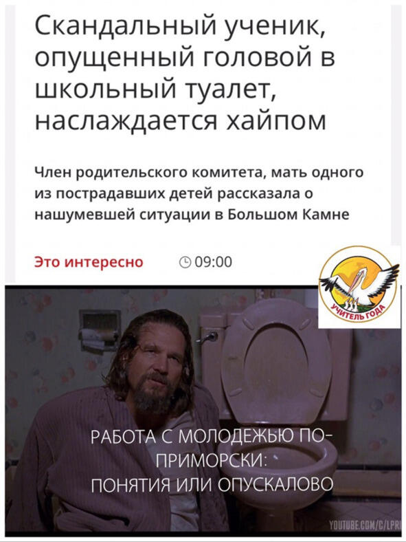 Новость смешная, ситуация страшная, как говорится. Но больше всего добила утренняя заметка с заголовком: «Скандальный ученик, опущенный головой в школьный туалет, наслаждается хайпом».