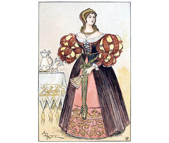 Костюм становится мягче, но сложнее. Корсет или лиф заменяет сюрко, он другого цвета, чем платье, и весь в золотых украшениях и орнаментах, под несколькими рядами ожерелий, покрывающих верхнюю часть декольте. Рукава также отличаются по цвету от лифа, они представляют собой большие крылья с вырезами или рукава из нескольких частей, скрепленные иглами или лентами, что открывает рубашку из тонкой ткани с пышным фризом на плечах и локтях.