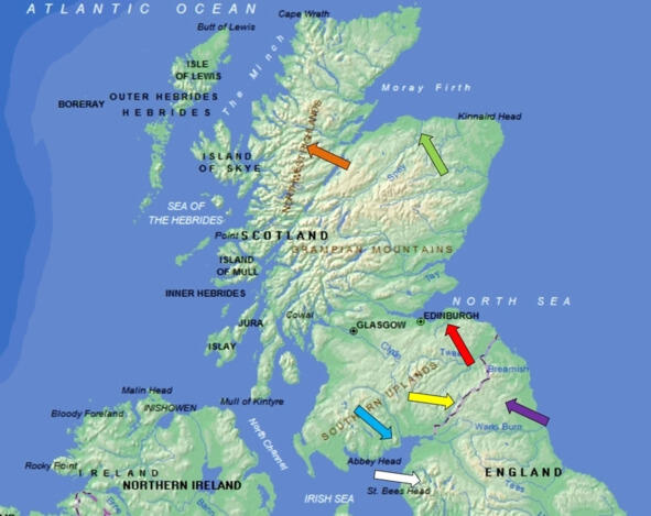 Карта Шотландии и Северной Англии. Лотиан (красная стрелка), Тевиодейл (желтая стрелка), Камберленд (белая стрелка), Галлоуэй (голубая стрелка), Хайленд (коричневая стрелка), Морей (зеленая стрелка), Нортумберленд (фиолетовая стрелка)