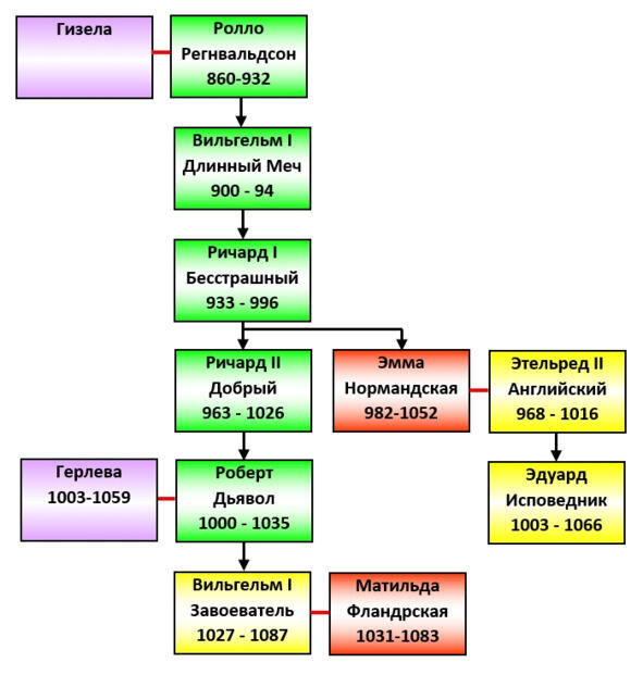 Нормандская династия (короли обозначены желтым цветом, королевы красным, герцоги Нормандии зеленым)