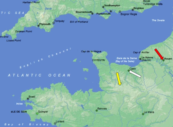 Место расположения замка Теншбре (желтая стрелка), Кан (белая стрелка), Руан (красная стрелка)