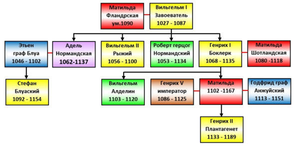 После смерти Вильгельма Аделина возник вопрос о наследовании престола Англии. У Генриха не было других законных детей, кроме дочери, Матильды, к тому времени бывшей замужем за Генрихом V, императором Священной Римской империи. Ее муж умер в 1125 году, после чего она в 1128 году вышла замуж за французского графа Годфрида Анжуйского (графство Анжу граничило с герцогством Нормандия).