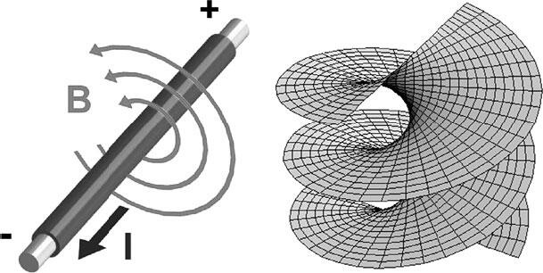 Мы растянуты между Землей и Небом, работая проводниками энергии точь-в-точь как проводник в электрическом поле, вокруг которого спирально поднимается магнитное поле. Происходит самая обычная работа электромагнитного поля вокруг электрического проводника, которым становимся мы сами (рис. 17).