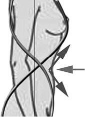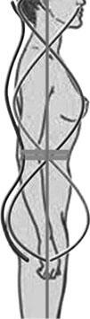 При хроническом спазме системы левитации «ротик» ЖКТ закрывается, обмен веществ замедляется. Посмотрите, во что при этом превращается наша осанка: грудь и ягодицы опускаются (зеленая линия), а живот растет вместе с холкой и сутулостью (красная линия) рис. 25. Передняя поверхность тела ползет вниз, а задняя поверхность подтягивается наверх.