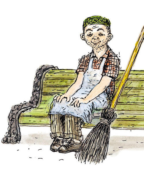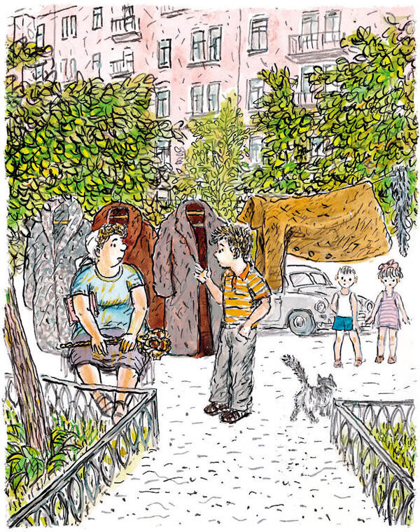 9Недалеко от скверика, под развешанными на верёвке шубами и пальто, сидела домработница Ксюша. Наверно, она устала выбивать пыль и читала книжку.