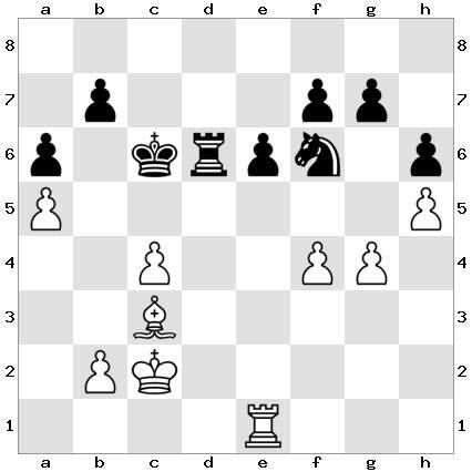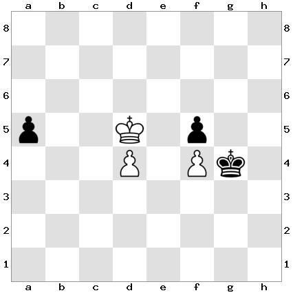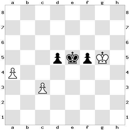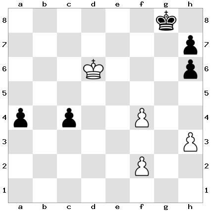 1. а5 f4 (если 1Крd6? то белые уничтожат обе черных пешки и пешка c3 пройдет в ферзи) 2. Крg4 Кре4 3. a6 f3 4. a7 f2 5. a8Ф f1Ф 6. Фе8+ Крd3 7.Фb5+ и черные теряют ферзя. Выигрыш.