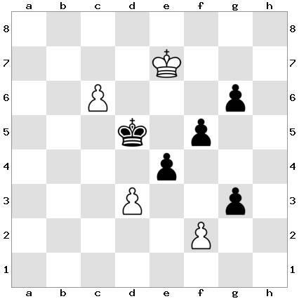 1. Крс4! Крf4 2. d5 Кре5 3. Крс5 a4 4. d6 Кре6 5. Крс6 а3 6. d7 a2 7. d8Ф a1Ф 8. Фе8+ Крf6 9. Фh8+ и черный ферзь гибнет. Выигрыш.