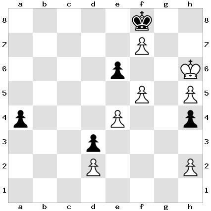 1. Крg6! (цель, преследуемая белыми, станет ясна позднее) 1а3 2. h6 a2 3. h7 3a1Ф 4. h8Ф+! Фh8 5. f6!! (теперь становится понятен замысел белых. Черный ферзь в капкане! цугцванг!) 5h3 6. е5 Фh4 пат или 5e5 6. h3 Фf6 7. Крf6 пат.