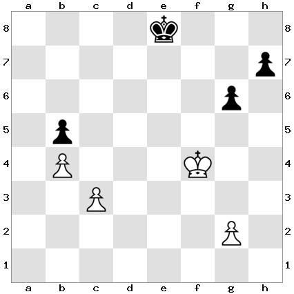 1. Крg5 Крf7 2. Крh6 Крg8 3. g3!! Крh8 4. g4 Крg8 5. g5 Крh8 6. c4! bc 7. b5 c3 8. b6 8c2 9. b7 с1Ф 10. b8Ф мат.