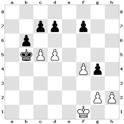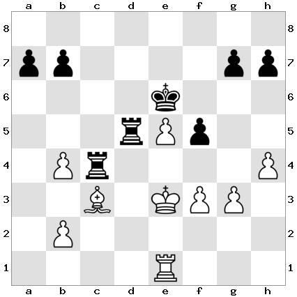 1Лс3+ 2. bc Ле5+ 3. Крd2 Ле1 4. Кре1 Крd5 5. Крd2 Крс4 6. h5 b6 7. Крс2 g5! (черные приводят пешки королевского фланга в статическое состояние) 8. h6 f4 9. g4 a5 10. ba ba 11. Крb2 a4 12. Кра3 Крс3 13. Кра4 Крd4 14. Крb4 Кре3 (белые пешки гибнут). Белые сдались.