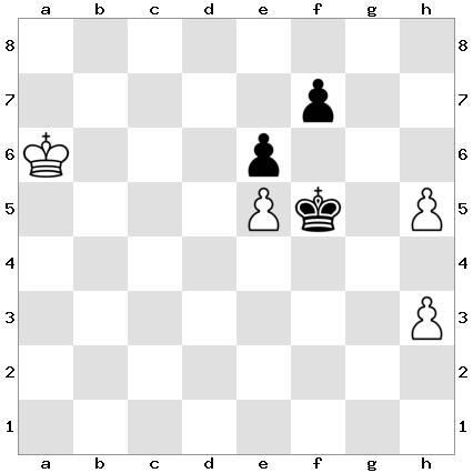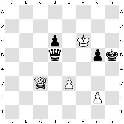 1h5+! 2. Крh5 Фh3+ 3. Крg5 Фg2+ 4. Крf5 Фd5+ 5. Крg6 Фd6+ 6. Фd6 Крd6 7. f5 a4 8. Крg7 a3 9. f6 a2 10. f7 a1Ф+ 11. Крg8 Фg1+ и белые сдались.