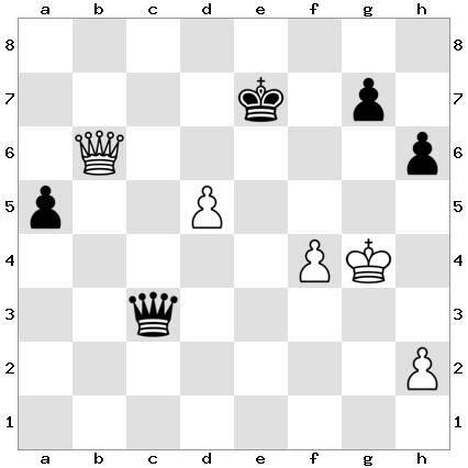 Проведем анализ позиции. Оба соперника имеют проходные пешки. Пешка a5 находится дальше от неприятельского короля, чем пешка d5. Это обстоятельство и определяет план игры черных, который сводится к тому, чтобы заставить соперника разменяться ферзями, перевести партию в пешечный эндшпиль и, тем самым, обеспечить продвижение пешки a5в ферзи.
