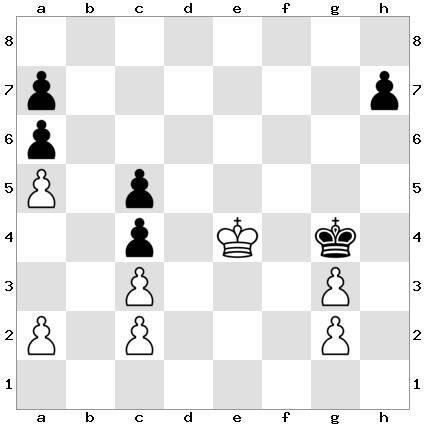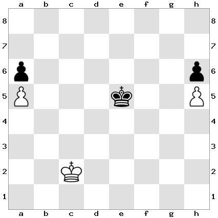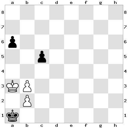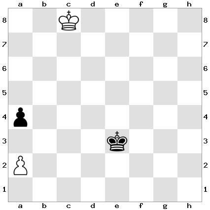 1. Крс5 Ка7 2. Крb6 Кс8+ 3. Крb7 Кd6+ 4. Крс7 Кb5+ 5. Крb6 Кd6! 6. а7 Кс8+ с выигрышем пешки. Ничья.