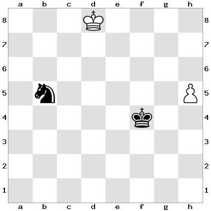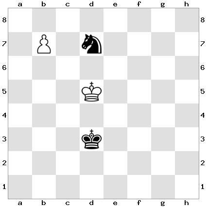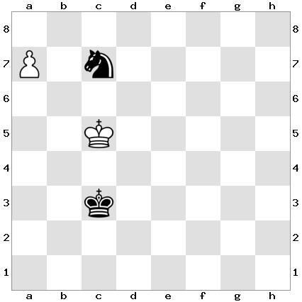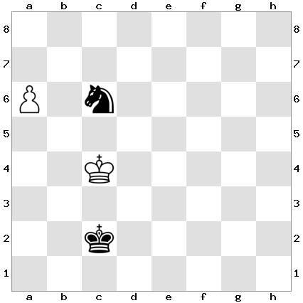 1. Крd6 Кb8 2. Крс7 Ка6+ 3. Крb6 Кb8 4. Кра7 Кс6+, и попытки короля оттеснить неприятельского коня от пешки ни к чему не приводят. Ничья.