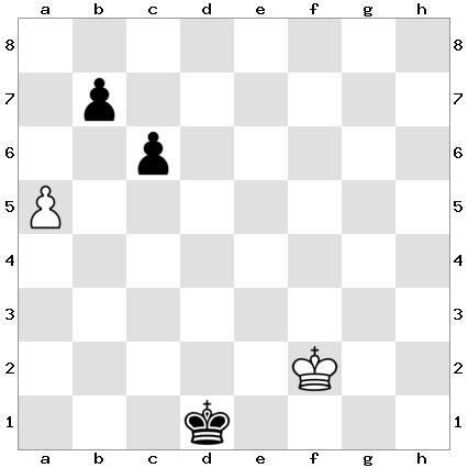 В этой позиции черный конь с поля c7 атакует пункты a8, e8, e6, d5, b5, a6 и косвенно защищает поля d6, d4 (1. Крd6? Kb5+ или 1. Крd6 Kb5+ и пешка a7 гибнет). Значит, белый король не сможет сразу атаковать коня черных и будет вынужден подбираться к нему обходным путем. На это ему потребуется уже не три хода, как планировалось раньше, а пять. Этого времени будет достаточно, чтобы король черных успел прийти на помощь своему коню.