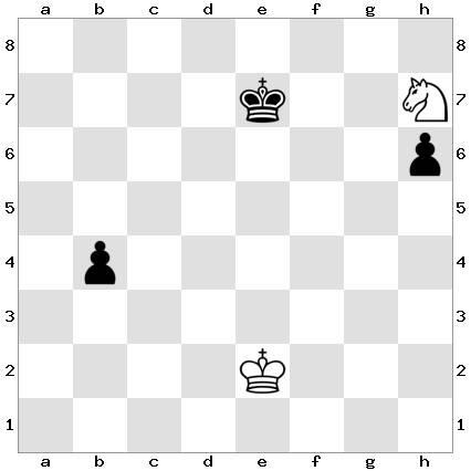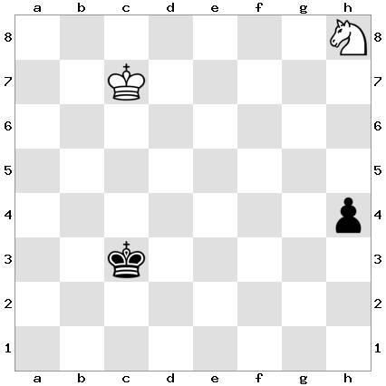 1. Крd3 Крf7 2. Крс4 Крg6! (2Кр g7? 3. Крb4 Крh7 4. Крс4 и черная пешка не проходит в ферзи. Ничья) 3. Кf8+! (3. Крb4? h5! 4. Кf8+ Крf5 и конь не успевает задержать пешку h выигрыш) 3Крf5 4. Kd7 h5 (4b3 5. Крс3!) 5. Kc5!! (маршрут лежит на f1. Ошибочно 5. Kb6? h4 6. Kd5 Кре4!! и пешка проходит в ферзи) 5h4 6. Kb3!! (ошибочно 6. Kd3?? 6h3 7. Kf2 h2 8. Крb4 Крf4 9. Крс4 Крf3 10. Kh1 Крg2 выигрыш) 6h3 7. Kd2 h2 8. Kf1! 8h1Ф 9. Kg3+ c ничьей.