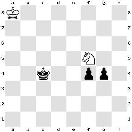 2. если удается с помощью вилки уничтожить одну из неприятельских пешек и получить ничейную позицию конь против пешки