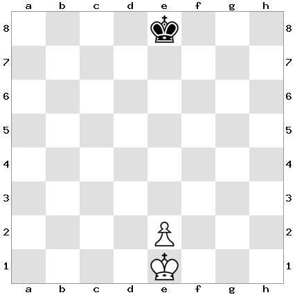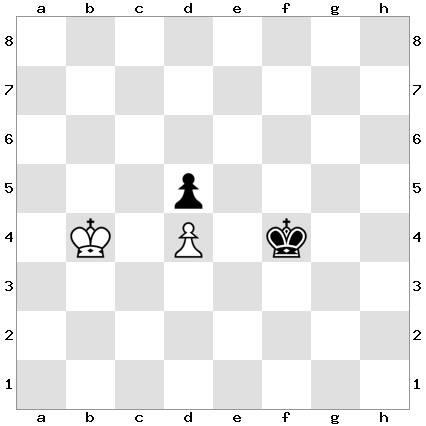 1. Крd2 Кре7 2. Крd3 Крd6 3. Кре4 (критическое поле занято!) 3Кре6 (черные получили оппозицию), но 4. е3! Пешка продвинулась вперед, а вместе с ней и ее критические поля. Теперь ими стали поля d5, e5, f5. 4Крd6 5. Крf5 (занимая критическое поле) 5Крd7 6. Крf6 (подготавливая ход е4) 6Крd8 7. е4 (пешку продвигаем вперед только после того, когда мы завладели новым критическим полем!) 7Крd7 8. е5 (король находится на критическом поле!) 8Кре8 9. Кре6 (занимая оппозицию и критическое поле) 9Крf8 10. Крd7 (занимая критическое поле) и пешка беспрепятственно проходит в ферзи. Выигрыш.