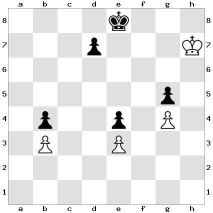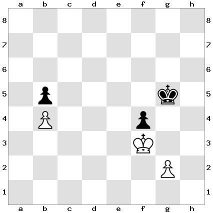 Если белые попытаются сразу разменять пешку g на пешку f ходом 1. g3? то 1fg 2. Крg3 и завладеть оппозицией с выигрышем пешки b5, этого для выигрыша будет не достаточно, так как черные успеют не допустить белого короля к критическим полям пешки b4 и в итоге ничья.