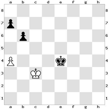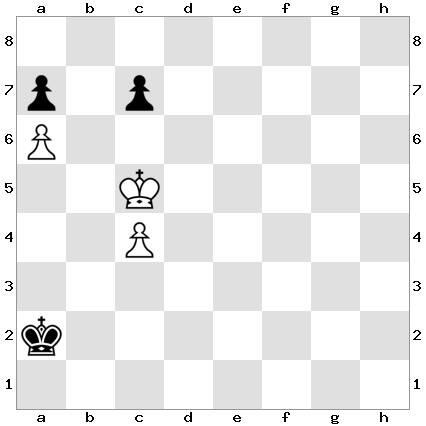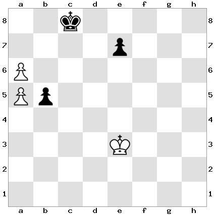 1. а5! b5! (1ba?? 2. Крb2! ничья, так как белый король находится на критическом поле пешки a) 2. a6! Крd5 3. Крb4 Крc6 4. Кра5! Крс5 пат.