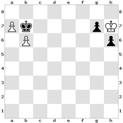 1. Крg6! (1. Крg7? h5! и черные выигрывают) 1Кра8 2. Крf5 h5 3. Кре6 h4 4. Крd7 4Крb7! 5. а8 Ф+! Кра8 6. Крc7 h3 7. b7+ и пешка проходит в ферзи с выигрышем.