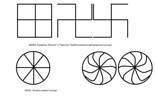 Символ Барба равносторонний прямой крест. Крест, наклоненный подобно букве «Х», это символ взаимодействия с видимым светом, знак взаимодействия, союза и оплодотворения. Пробужденные стихии начинают развитие, вторя движению солнечного луча света слева вверх направо. Вращение пробудившихся стихий, Коловрат, оставляет за собою энергетический след. Символ Крест преобразуется в символ шагающей Свастики.