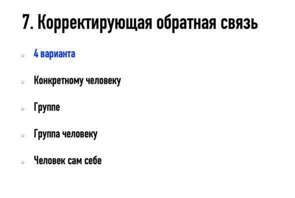 Следующий инструмент работы на личной беседе в рамках обучения это корректирующая обратная связь. Приведу несколько примеров, какие бывают формы обратной связи, если вы обучаете не одного человека, а группу. То вы даете обратную связь: