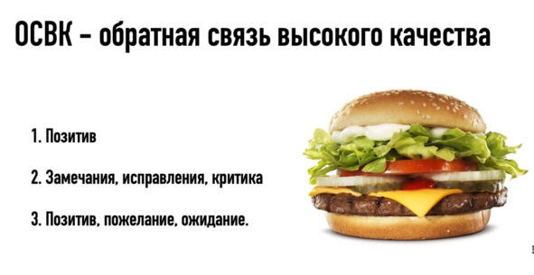Есть такая концепция ОСВК или обратная связь высокого качества. Это как бургер: хлеб, хлеб, мясо в середине:
