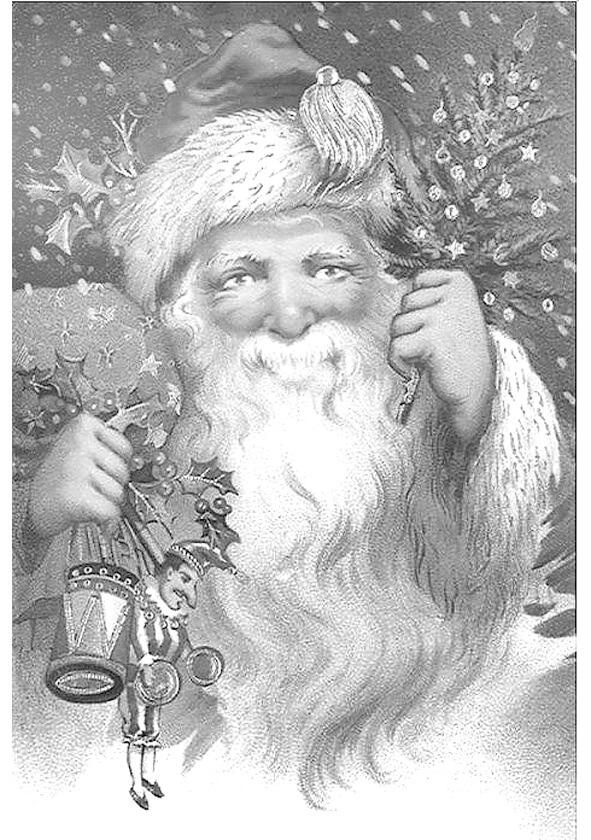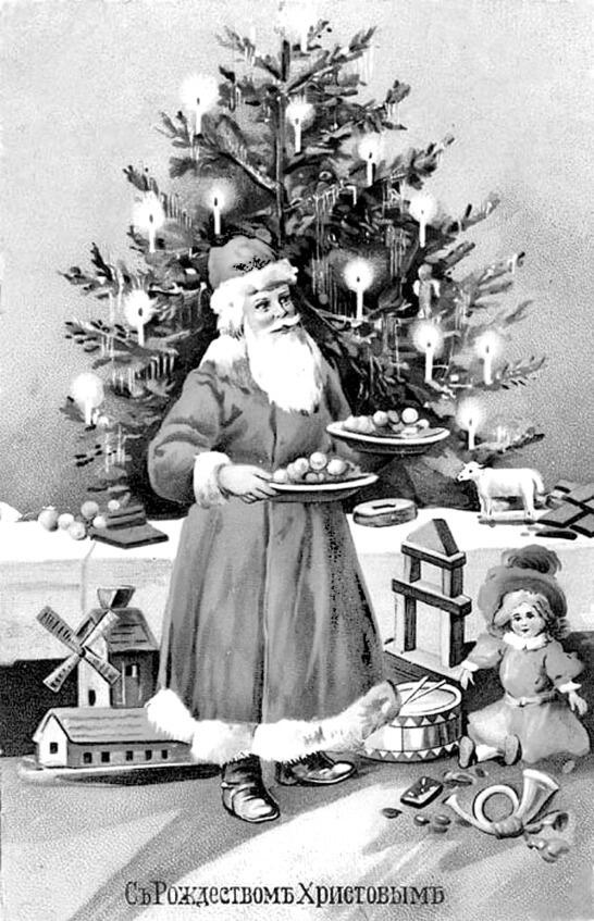 Так изображали раздающего праздничные подарки святителя Николая (Санта Клауса) в России до 1917 г. С Рождественской открытки конца XIX столетия