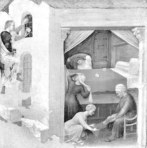 Будущий святитель Николай раздает свое наследство отцу девушек, чтобы они могли выйти замуж. Три мешочка с деньгами, которые он тайно бросал им в окно, попадали в чулки, и стали прообразом традиции Рождественских подарков и доброго Санта Клауса. С картины из серии «Сцены из жизни Святого Николая Барийского» работы Джентиле да Фабриано (Gentile da Fabriano). Ок.1425 г. Пинакотека Ватикана
