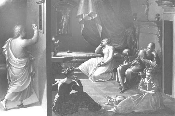 Милосердие Святого Николая, бросающего золотые шары (символы монет) в носки-чулки через окно. С картины, предположительно, работы Джироламо Маккьетти. Около 15551560 гг.