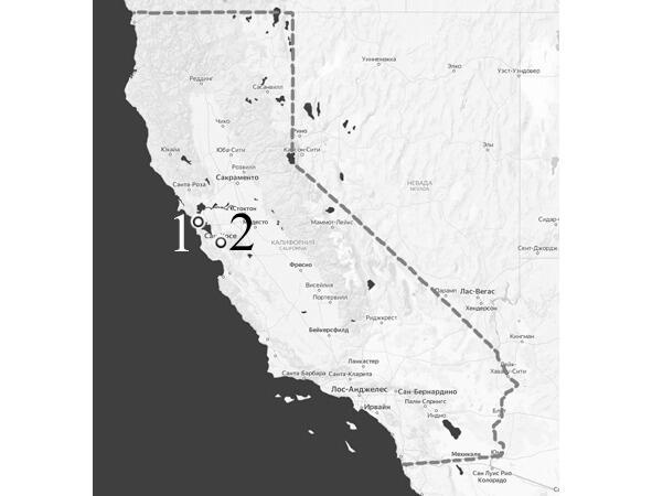 Карта Калифорнии с указанием мест первых нападений таинственного некрофила: 1 убийство Клары Ньюман в г. Сан-Франциско 20 февраля 1926 г.; 2 убийство Лоры Бил в г. Са-Хосе 2 марта того же года. Расстояние между этими городами ~65 км. по прямой линии.