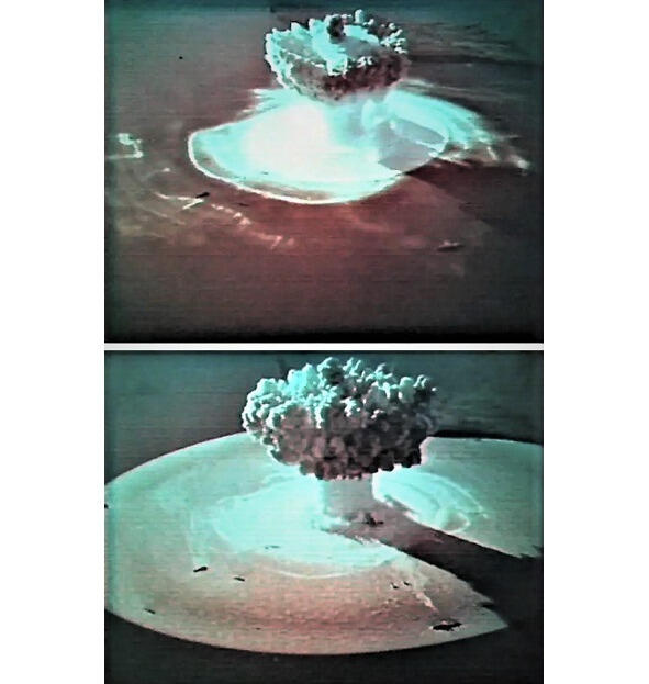 Через пару недель, где-то в конце июля-начале августа (точно не могу вспомнить) на построенной на той же Губе вышке произвели надземный взрыв. Это было не так интересно, как торпедный залп, и запомнилось лишь тем, что в назначенный час атомное устройство не взорвалось, и к башне на шлюпке доставляли какого-то учёного, который и устранил неисправность. Конечно, от башни ничего не осталось».